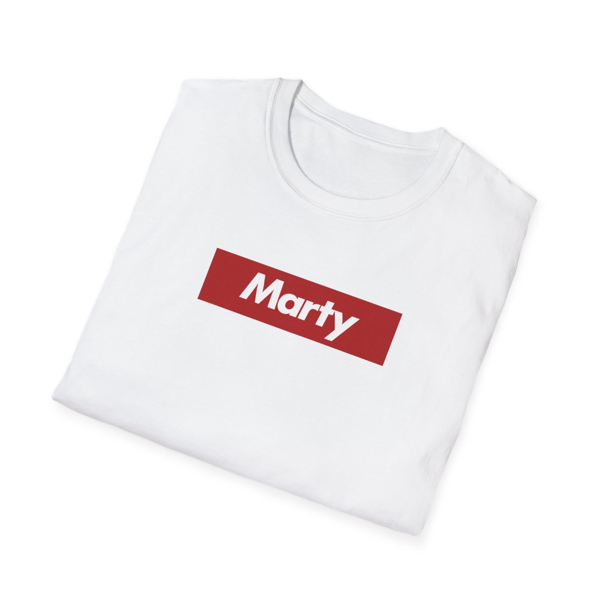 Level up your wardrobe with the MARTY tee — a perfect fusion of high-fashion streetwear irony and time-bending cinematic hype. Featuring a crisp red bar and bold white lettering, it nods unmistakably to that iconic brand while winking straight at the upcoming Timothée Chalamet blockbuster, Marty Supreme.